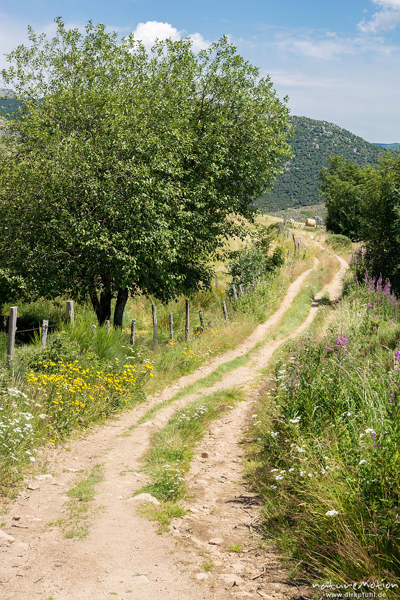 Feldweg, Zaun, Viehweiden, Tal des Le Rieubellet zwischen Finiels und Le Pont-de-Montvert, Florac, Frankreich