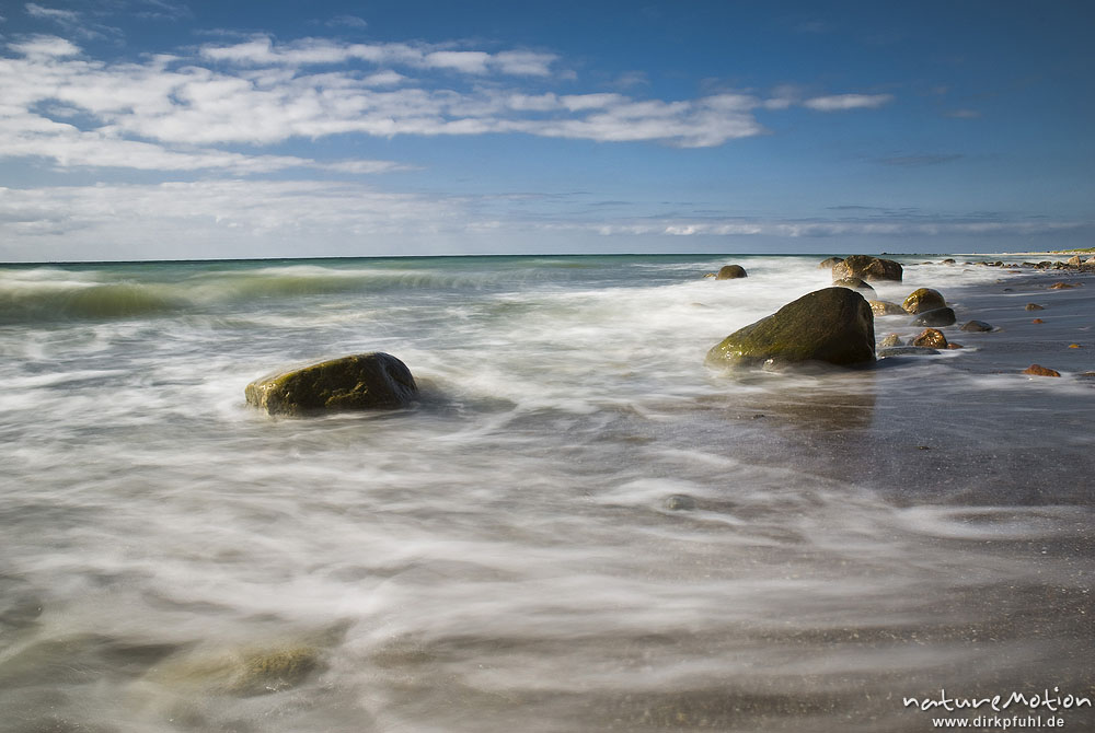 Felsen am Strand von Ahrenshoop, leichte Brandung, auflaufendes Wasser, ablaufendes Wasser, lange Belichtungszeit, Darß, Zingst, Deutschland