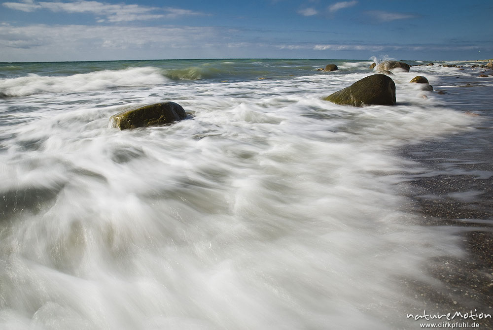 Felsen am Strand von Ahrenshoop, leichte Brandung, auflaufendes Wasser, ablaufendes Wasser, lange Belichtungszeit, Darß, Zingst, Deutschland