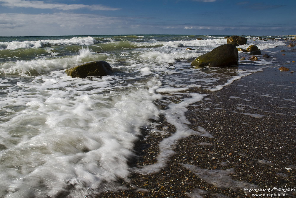 Felsen am Strand von Ahrenshoop, leichte Brandung, auflaufendes Wasser, ablaufendes Wasser, lange Be, Darß, Zingst, Deutschland