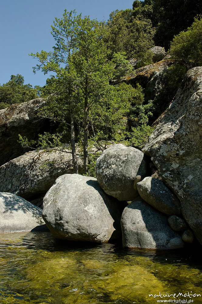 Felsen im Bachbett, übereinander gestapelt, Restonica-Tal, Korsika, Frankreich
