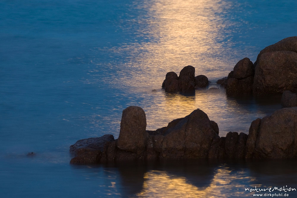 Felsen im Mondlicht, Lichtreflexe auf dem Wasser, Bucht von Palombaggia, Abenddämmerung, lange Belichtungszeit, Zeitreihe, Korsika, Frankreich