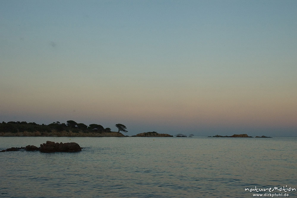 Felsen und Pinie im Abendlicht, Bucht von Asciaghjiu Korsika, Frankreich