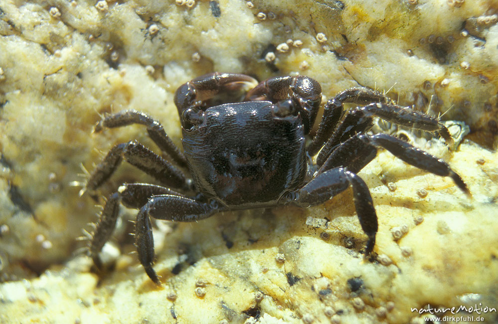 Felsenkrabbe, Rennkrabbe, Pachygrapsus marmoratus, Quadratkrabben (Grapsidae), in Wasserbecken, Felswatt, Bretagne, Frankreich