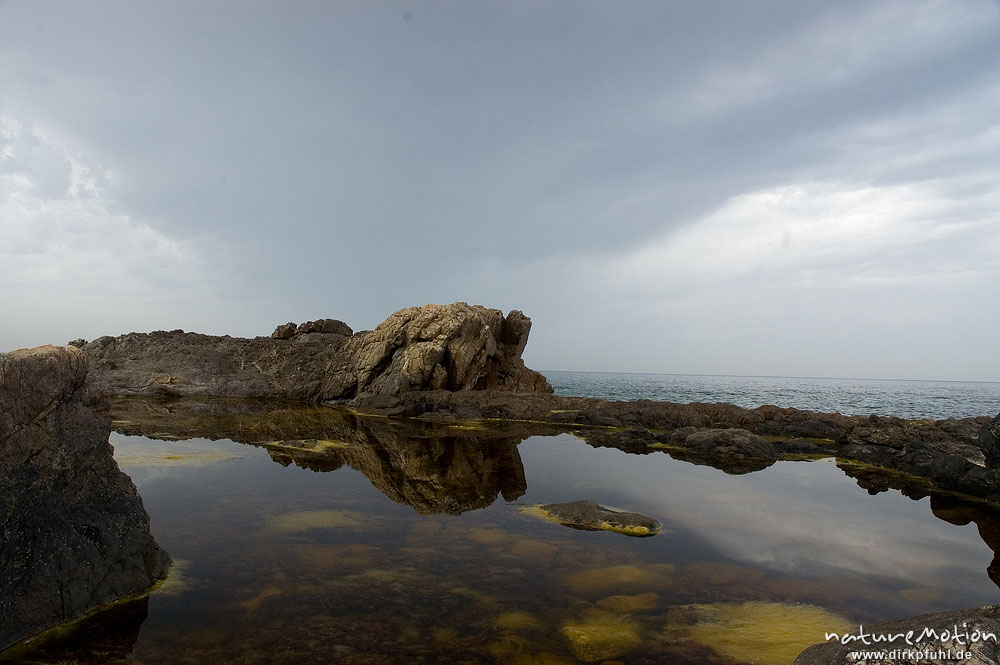 Felsenküste bei Bodri, Gezeitenbecken, Wolken Korsika, Frankreich
