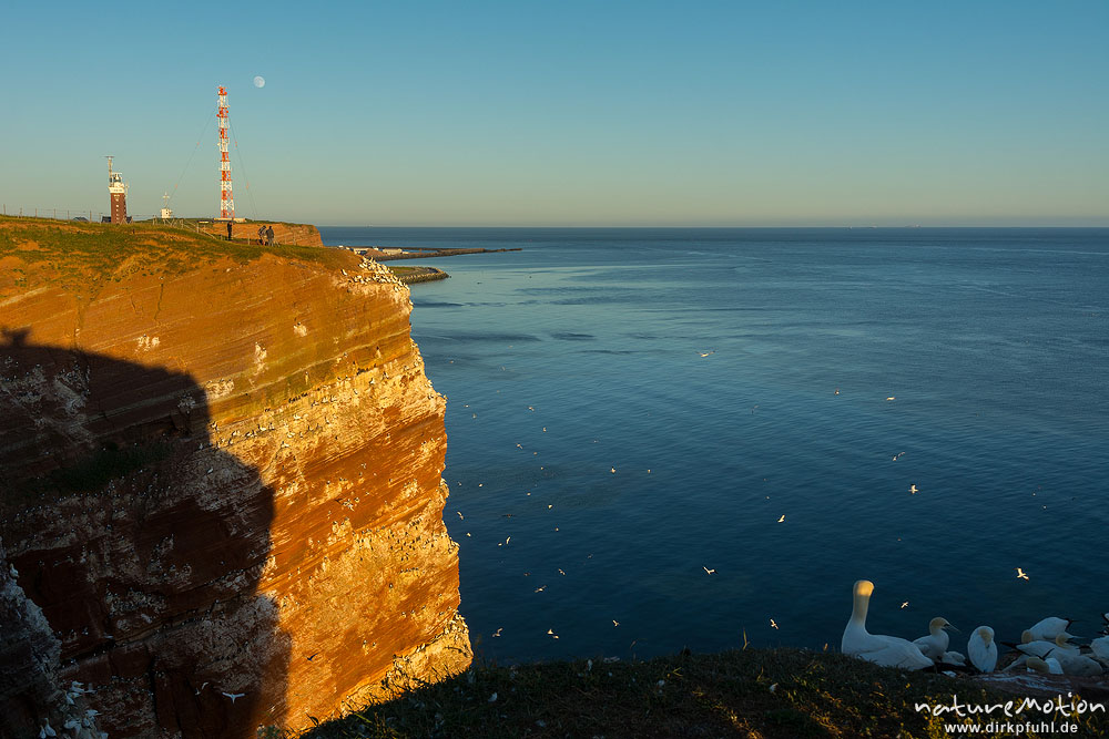 Felsküste mit Brutvogelkolonie, Antennenmast, Vollmond, Helgoland, Deutschland