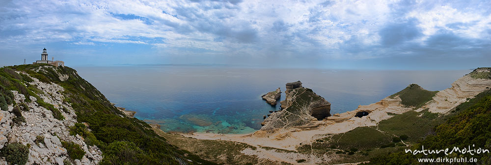 Felsküste mit Leuchtturm und verwitterten Kalksteinfelsen, Capo Pertusato, Korsika, Frankreich