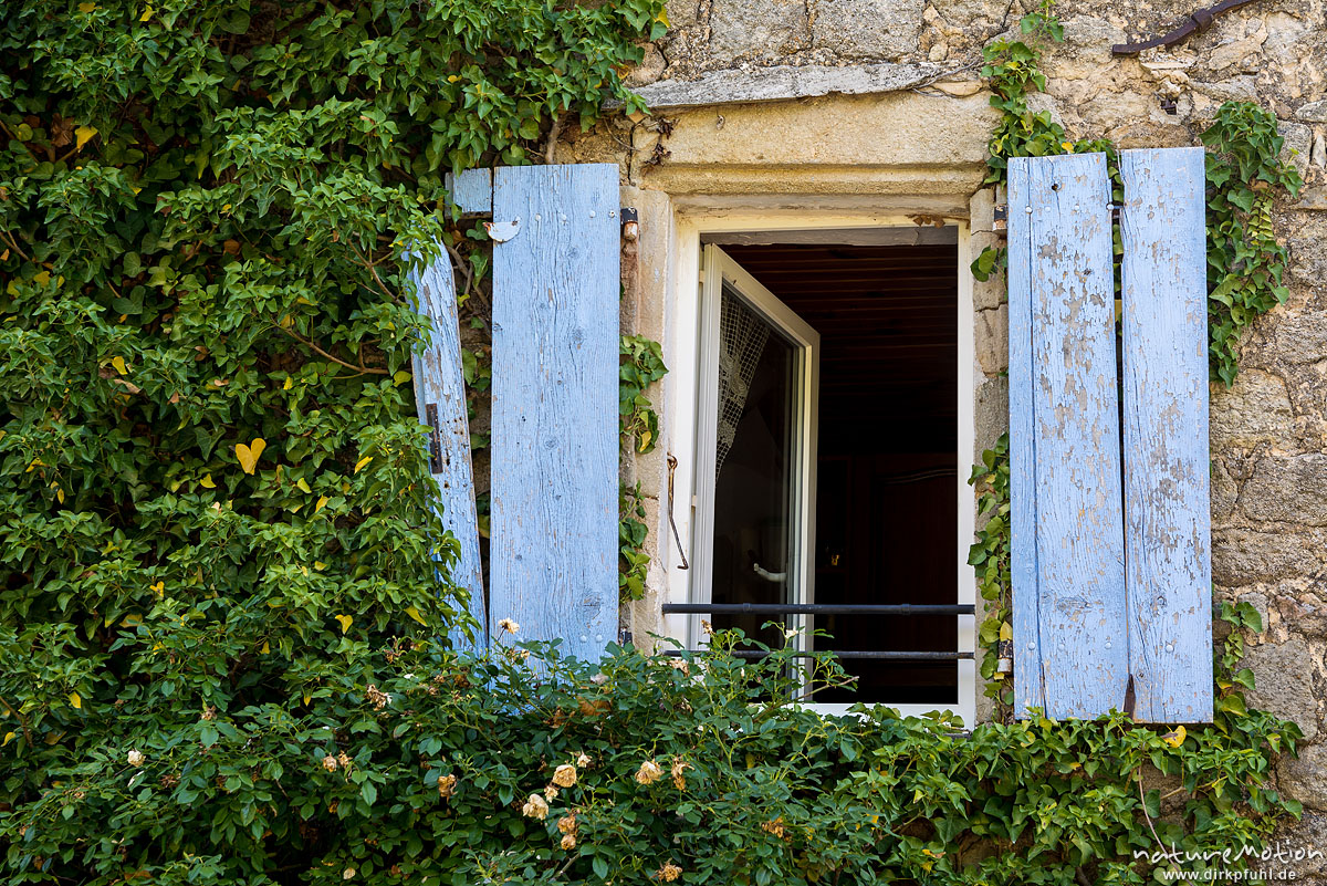 Fenster mit blauen Fensterläden, Fassade mit Laub bewachsen, Chassiers, Frankreich