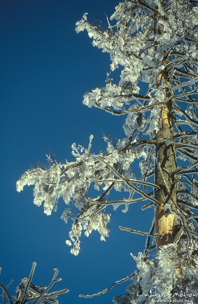 Fichtenstamm mit vereisten Zweigen vor blauem Himmel, Wolfswarte, Harz, Deutschland