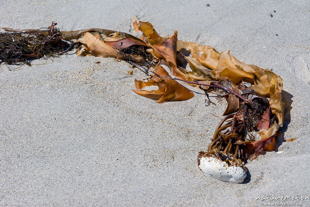Fingertang, Laminaria digitata, Laminariacea,angespülter Tangwedel mit losgerissenem Kalkstein, Nordstrand, Düne, Helgoland, Deutschland
