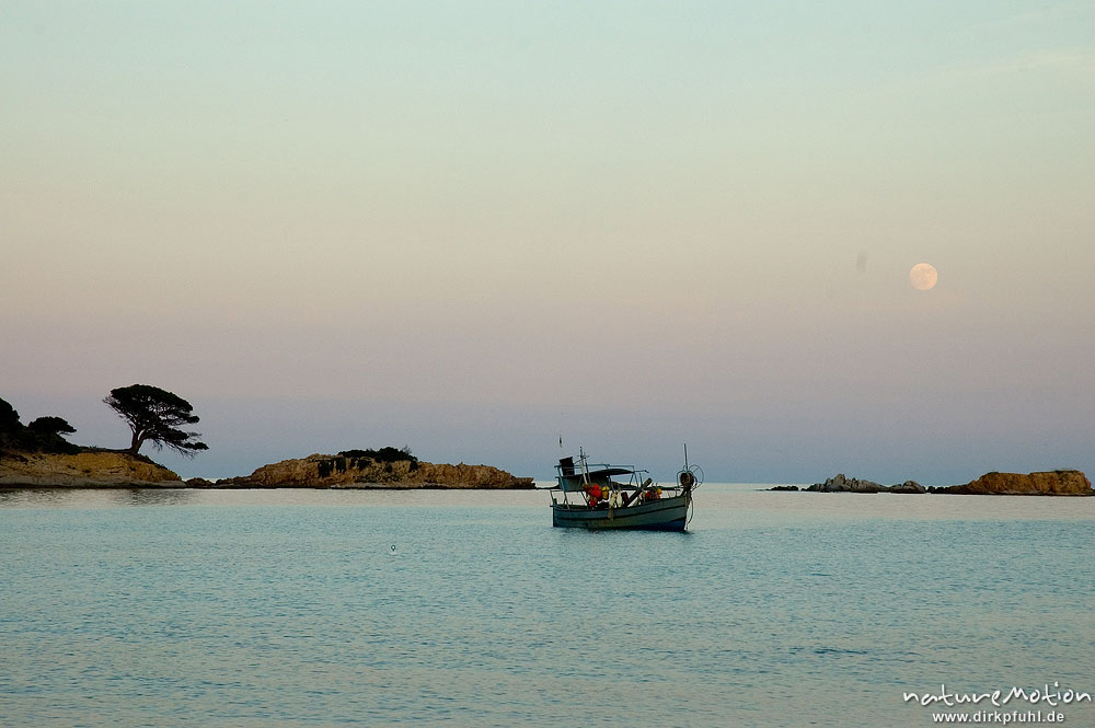 Fischerboot, Felsen und Vollmond, Bcuht von Palombaggia Korsika, Frankreich