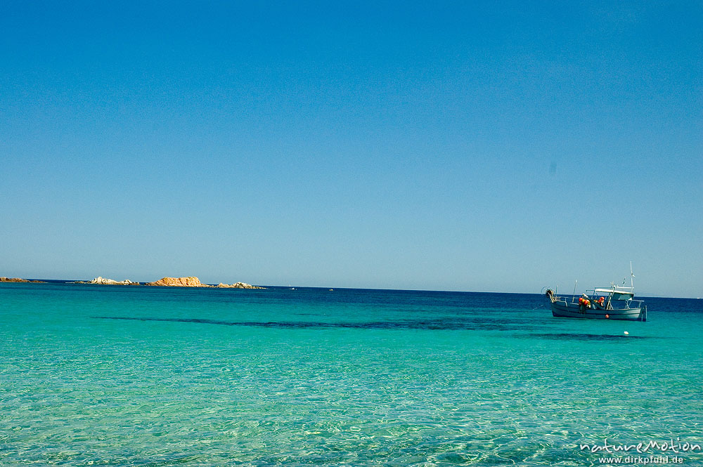 Fischerboot in türkisblauem Wasser, Bucht von Palombaggia Korsika, Frankreich