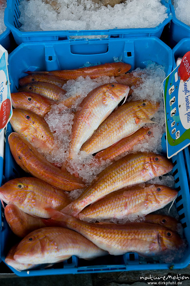 Fischstand, Markthalle mit Verkaufsständen, Ille Rousse, Korsika, Frankreich