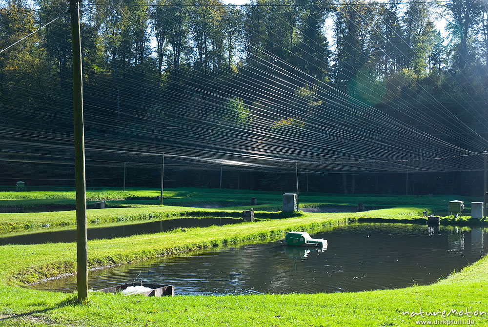 Fischteiche mit aufgespannten Netzen als Schutz vor Greifvögeln und Kormoranen, Fischzuchtbetriebe Reinhardswald, Wülmersen, Trendelburg, Deutschland