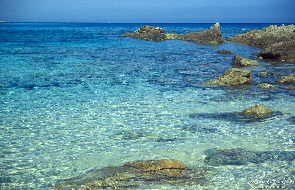Flachwasser mit Felsen, Strand bei Bodri, Korsika, Frankreich