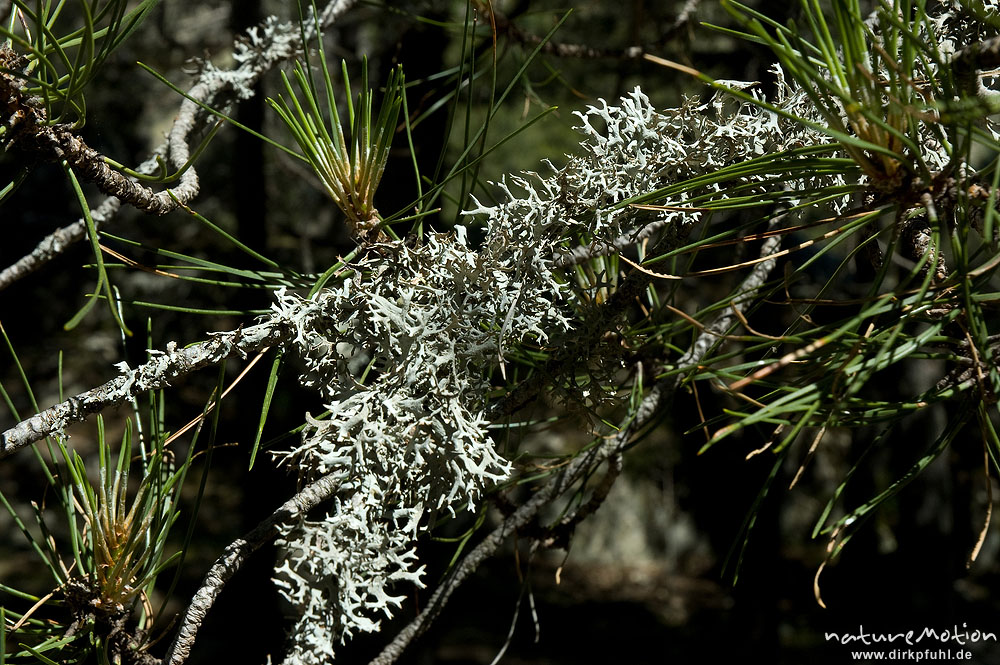 Flechten an Kieferzweig, Refuge de Sega, Tavignano-Tal Korsika, Frankreich
