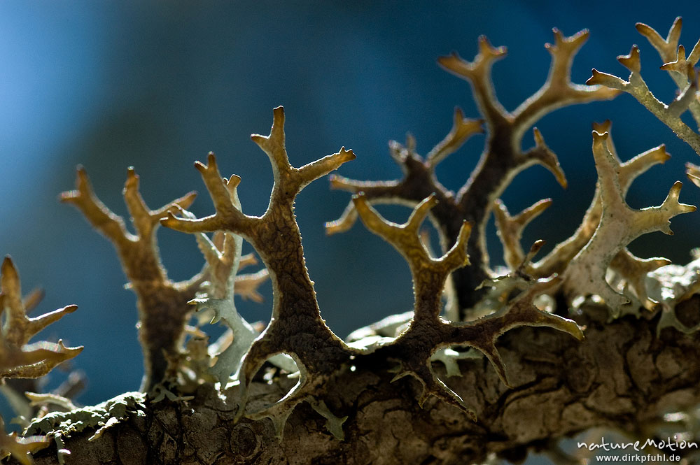 Flechten an Kieferzweig, Refuge de Sega, Tavignano-Tal Korsika, Frankreich