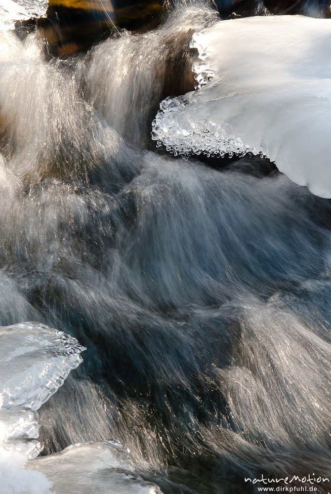 fließendes Wasser an vereistem Bachufer, Eiskristalle und angeschmolzene Eisschollen, Niemetal, A nature document - not arranged nor manipulated, Löwenhagen, Deutschland