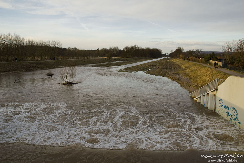 Flütegraben mit offenem Wehr, Hochwasser, Kiessee, Göttingen, Deutschland