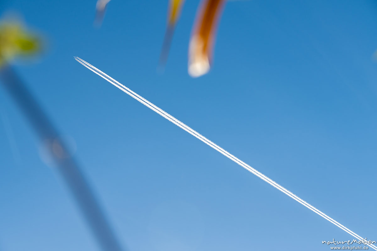 Flugzeug zieht Kondensstreifen über blauen Himmel, Göttingen, Deutschland