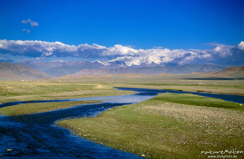 Fluss in der Steppe, im Hintergrund schneebedeckte H?henz?ge des Altai, Bujant Gol Chowd, Mongolei