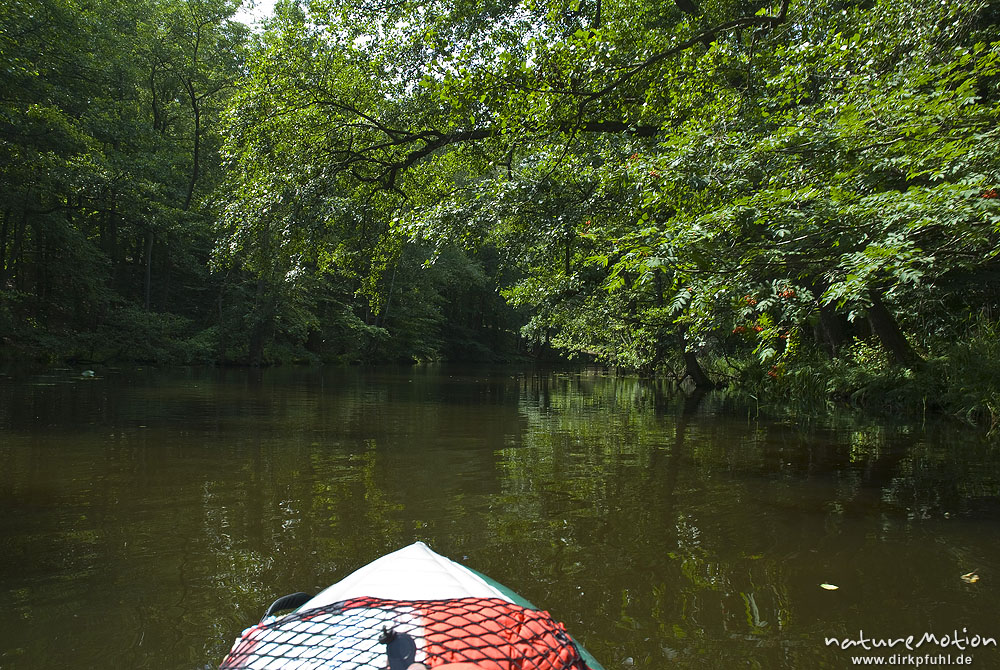 Flusslauf mit Weichholzaue und Ufervegetation, Havel zwischen Görtowsee und Zierzsee, Bug eines Kajaks, Blankenförde, Deutschland