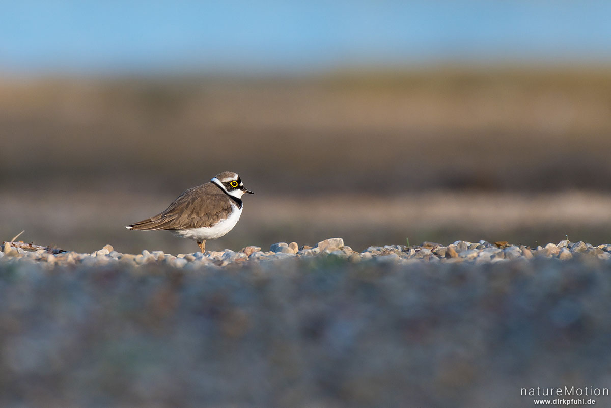 Flussregenpfeifer, Charadrius dubius, Regenpfeifer (Charadriidae), Tier auf Nahrungssuche, Rosdorfer Baggersee, Göttingen, Deutschland