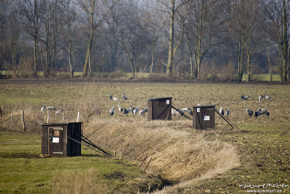 Fotoverstecke, Fotohütten, Kraniche, Ablenkungsfütterungsfläche Günzer Wiesen, Groß Mohrdorf, Deutschland