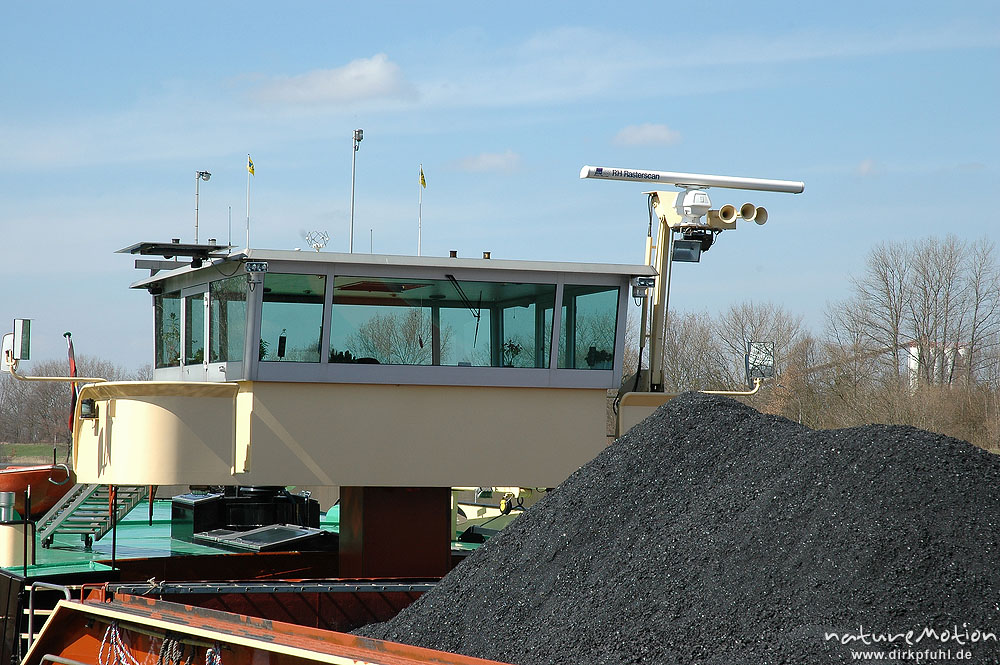Frachtschiff auf der Elbe, Steuerhaus, aufgeschütteter Kies im Frachtraum Hamburg, Deutschland