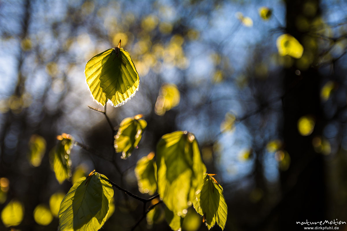frisches Buchenlaub im Gegenlicht der Abendsonne, Brodenbach (Mosel), Deutschland
