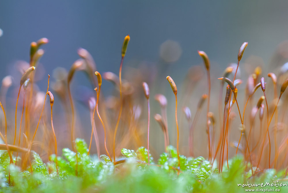 Fruchtk?rper, Sporangien, Moosteppich auf einem Baumstumpf, Buchenwald, Reiffenhausen, Deutschland