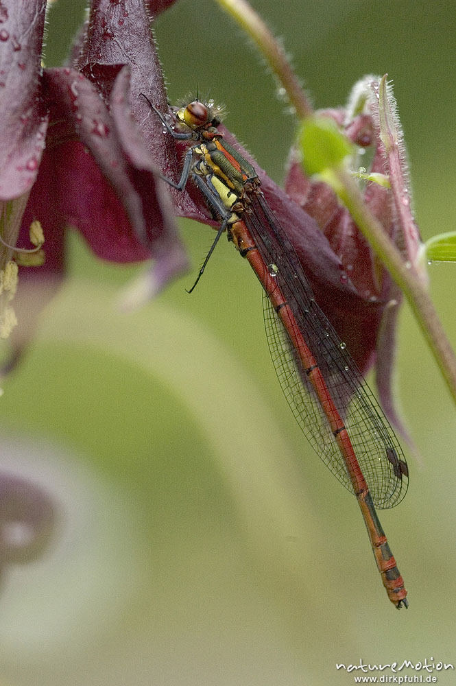 Frühe Adonislibelle, Pyrrhosoma nymphula, Männchen, sitzend an Akelei-Blüte, seitlich, Regentropfen, Botanischer Garten, Göttingen, Deutschland