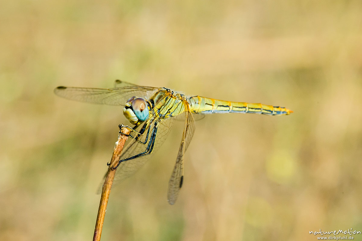 Frühe Heidelibelle, Sympetrum fonscolombii, Segellibellen (Libellulidae, Weibchen, sitzend an Halm,, Korsika, Frankreich
