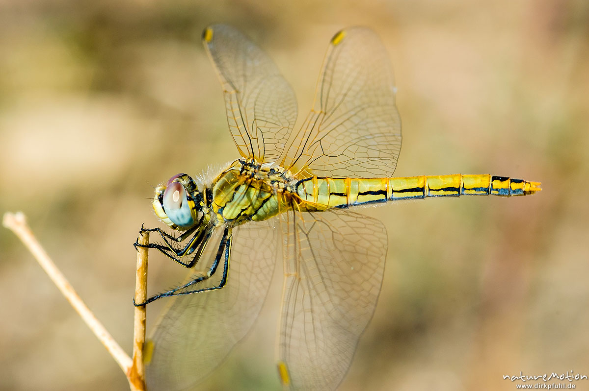 Frühe Heidelibelle, Sympetrum fonscolombii, Segellibellen (Libellulidae, Weibchen, sitzend an Halm, Vorderansicht, Bodri, Korsika, Frankreich