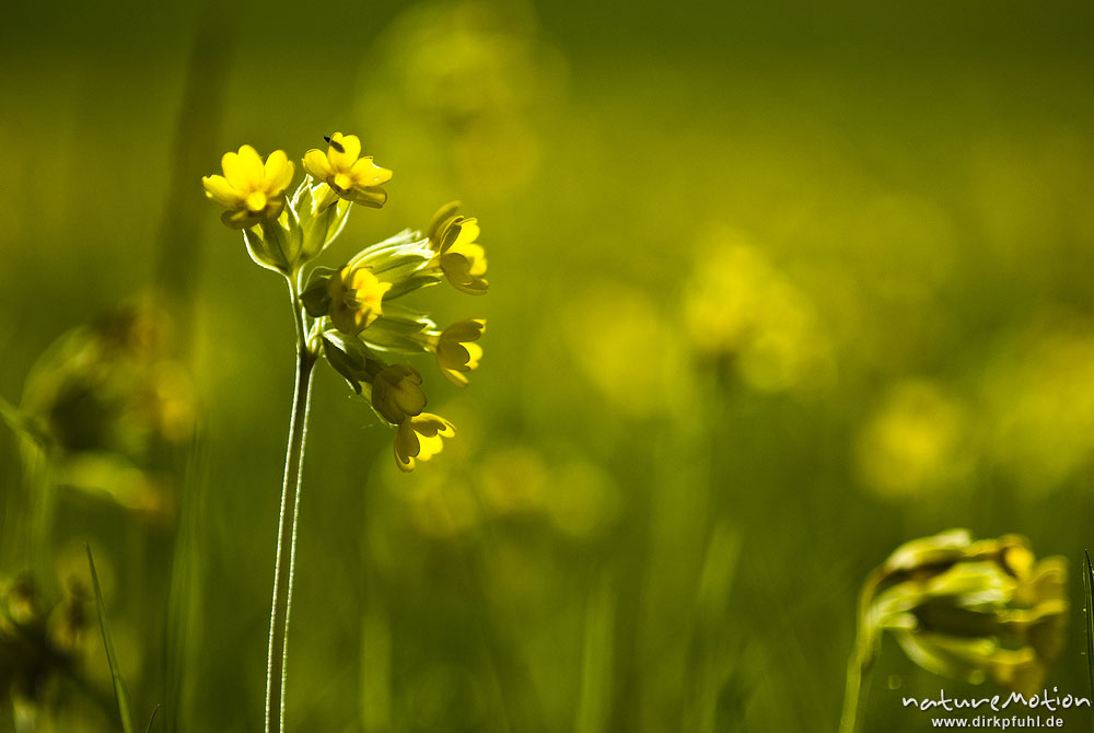 Frühlings-Schlüsselblume, Wiesen-Schlüsseblume, Primula veris, Primulaceae, Blütenstand im Gegenlicht, dichter Bestand, Kerstlingeröder Feld, Göttingen, Deutschland