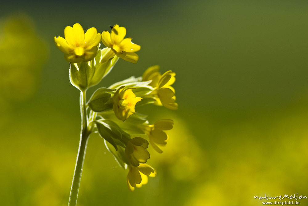 Frühlings-Schlüsselblume, Wiesen-Schlüsseblume, Primula veris, Primulaceae, Blütenstand im Gegenlicht, dichter Bestand, Kerstlingeröder Feld, Göttingen, Deutschland