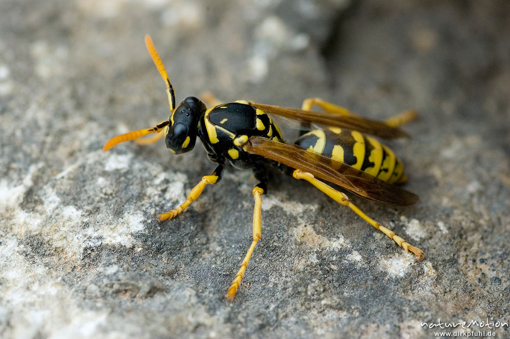 Gallische Feldwespe, Polistes dominulus, früher P. gallicus, Wächterin am Eingang des Nestes, Lumio Korsika, Frankreich