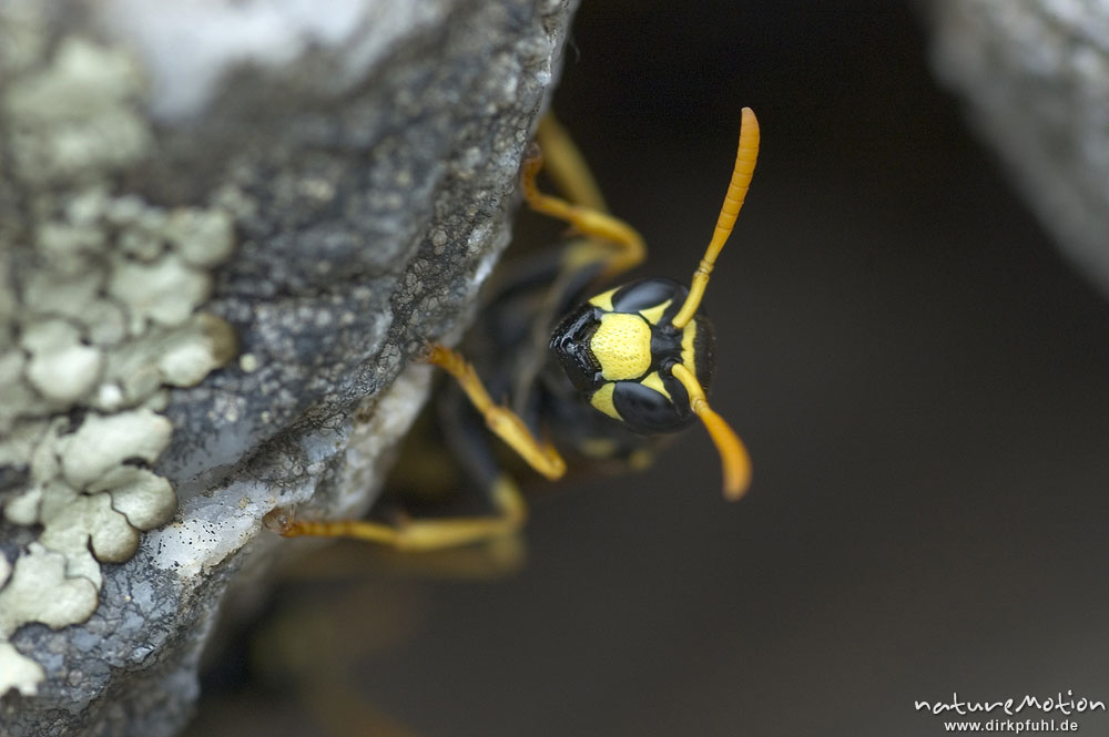Gallische Feldwespe, Polistes dominulus, früher P. gallicus, Wächterin am Eingang des Nestes, Lumio, Kombination aus zwei Bildern unterschiedlicher Schärfeebene, Korsika, Frankreich
