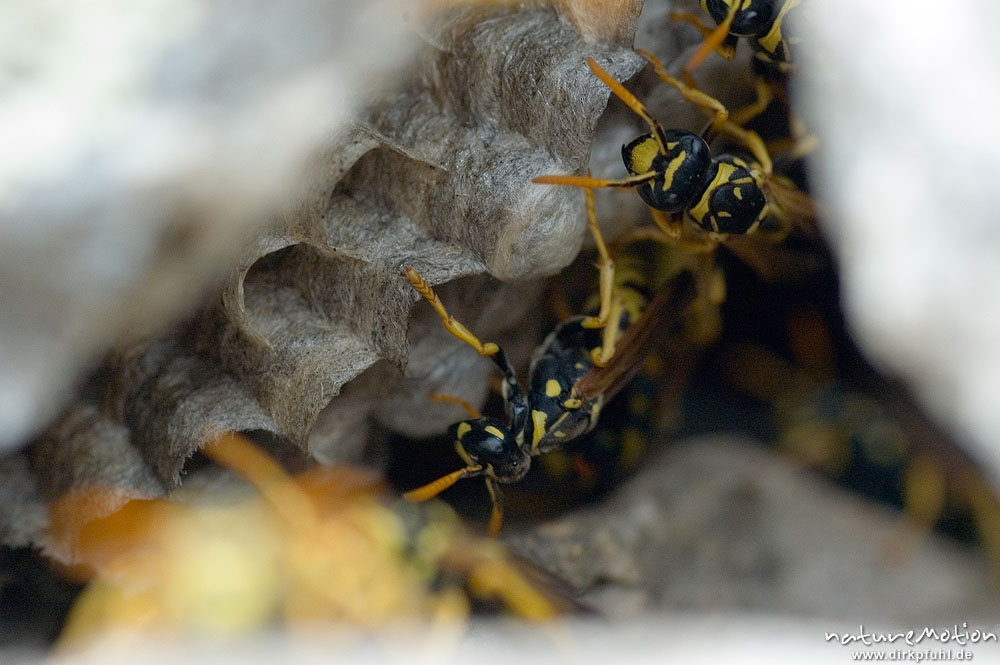 Gallische Feldwespe, Polistes dominulus, Vespidae, früher P. gallicus, Waben und Arbeiterinnen im Ne, Korsika, Frankreich