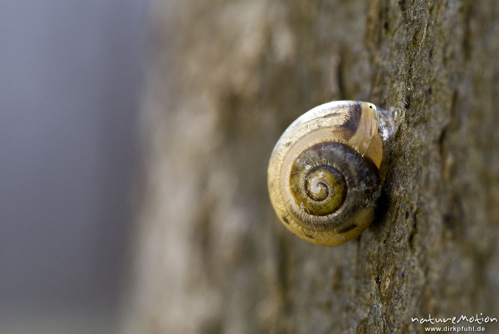 Garten-Bänderschnecke, Cepaea hortensis, Helicidae, festgeheftet an Buchenstamm Settmarshausen bei Göttingen, Deutschland