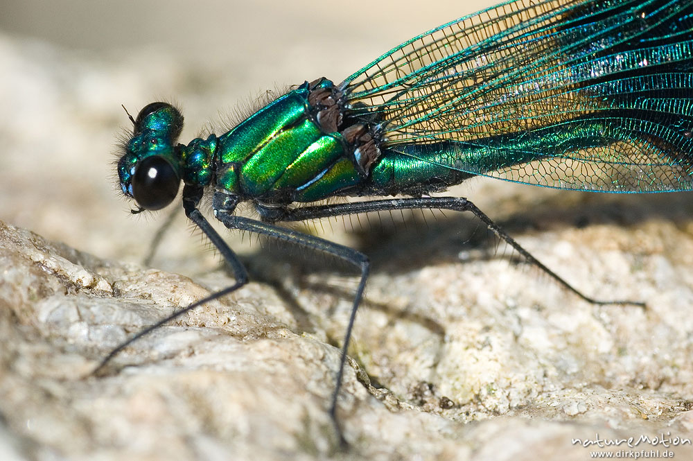 Gebänderte Prachtlibelle, Calopteryx splendens, Calopterigidae, Kopf und Thorax, Männchen auf Stein, Babker Mühle, Havel (Fluss), Deutschland