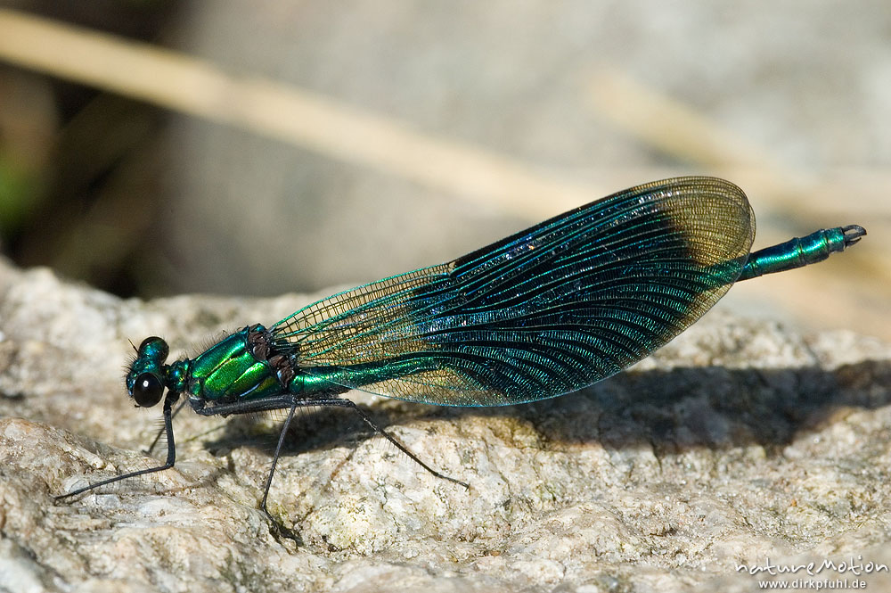Gebänderte Prachtlibelle, Calopteryx splendens, Calopterigidae, Männchen auf Stein, Babker Mühle Havel (Fluss), Deutschland
