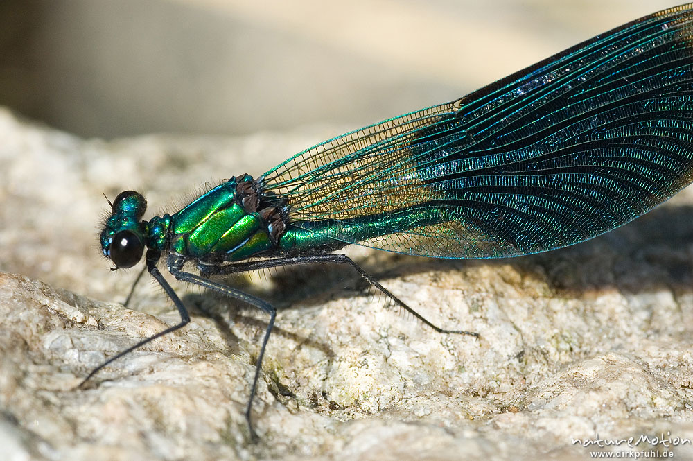 Gebänderte Prachtlibelle, Calopteryx splendens, Calopterigidae, Männchen auf Stein, Babker Mühle Havel (Fluss), Deutschland