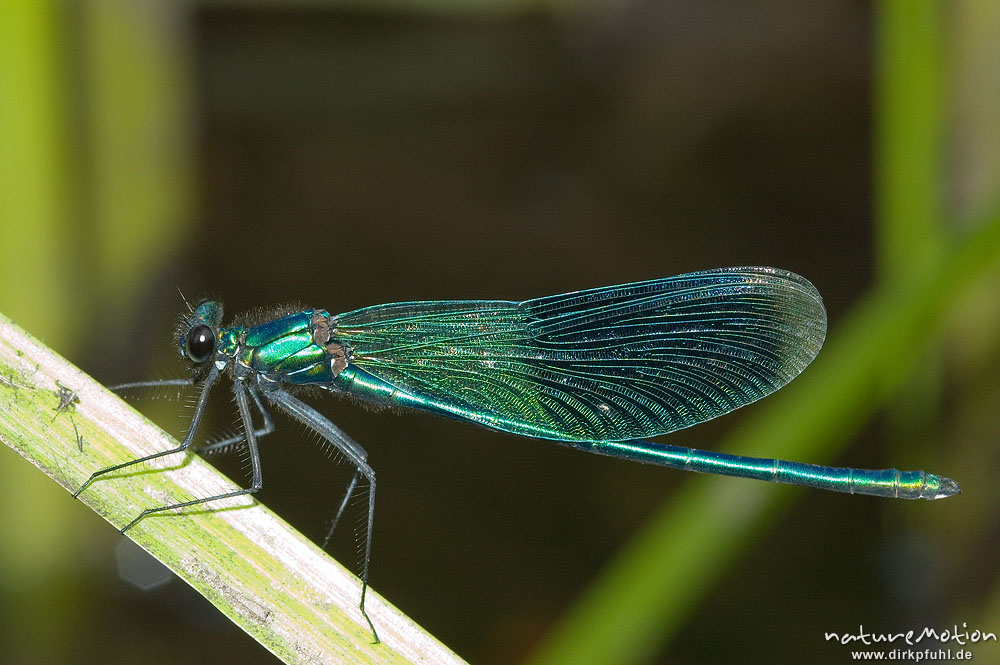 Gebänderte Prachtlibelle, Calopteryx splendens, Calopterigidae, Männchen Schilfblatt, Ansitz, Babker Mühle, Havel (Fluss), Deutschland