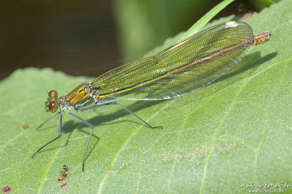 Gebänderte Prachtlibelle, Calopteryx splendens, Calopterigidae, Weibchen auf Blatt, Babker Mühle Havel (Fluss), Deutschland