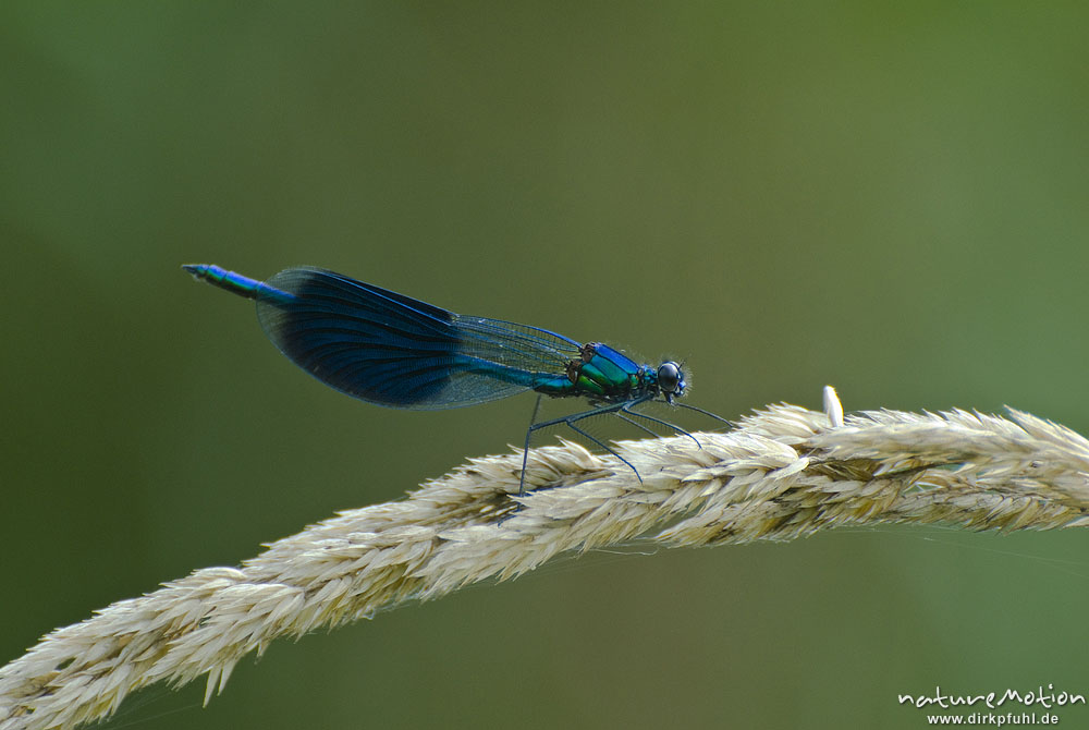 Gebänderte Prachtlibelle, Calopteryx splendens, Prachtlibellen (Calopterigidae), Männchen auf Grashalm, Wiesengraben Nähe Leinewehr, Göttingen, Deutschland