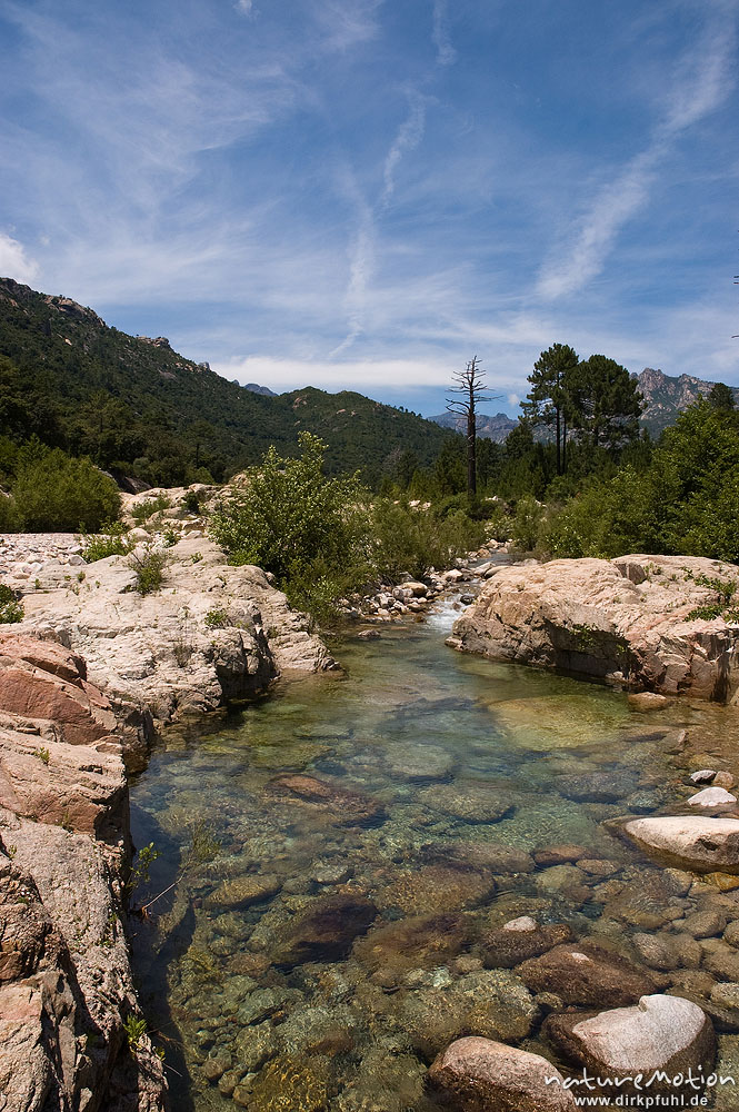 Gebirgsbach mit ausgewaschenen Felsen, Tal des Cavo Korsika, Frankreich