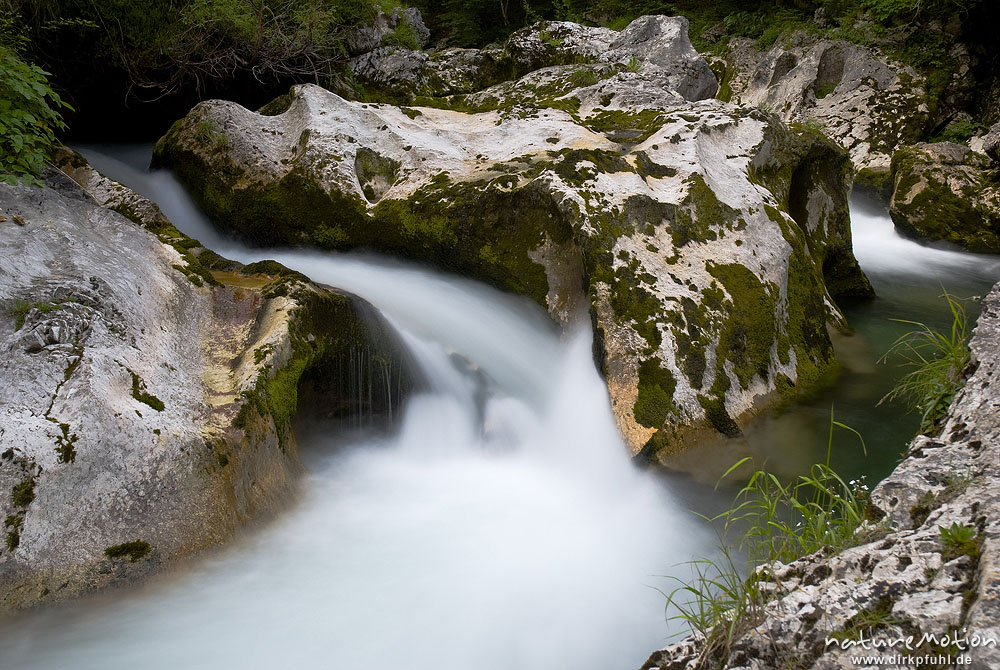 Gebirgsbach mit ausgewaschenen Felsformationen, Tal der Mostnica, Triglav-Nationalpark, Slowenien