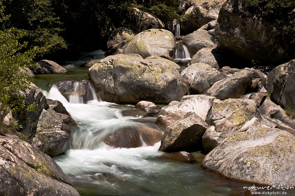 Gebirgsbach mit glatt geschliffenen Felsen, Schwarzkiefern, Manganello-Tal Korsika, Frankreich