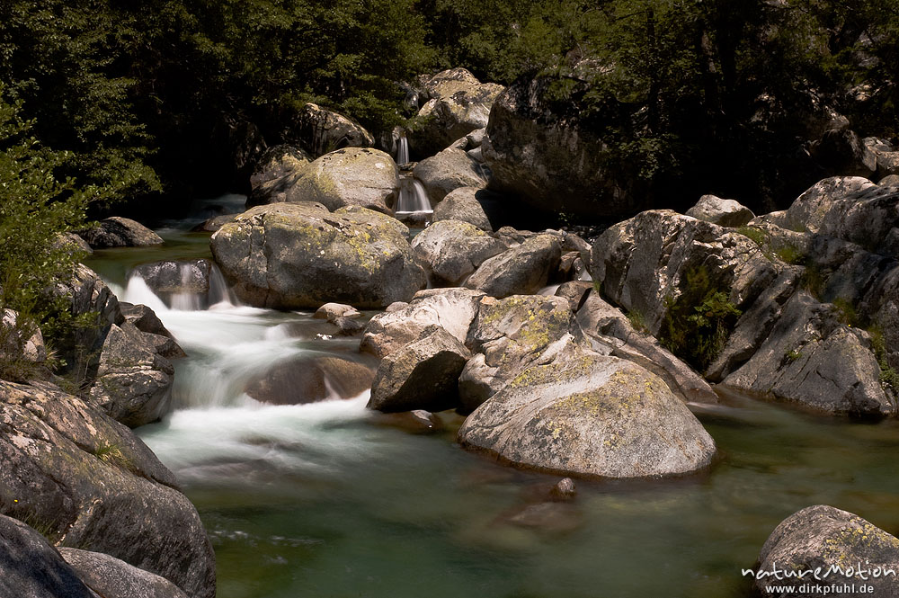 Gebirgsbach mit glatt geschliffenen Felsen, Schwarzkiefern, Manganello-Tal, Korsika, Frankreich